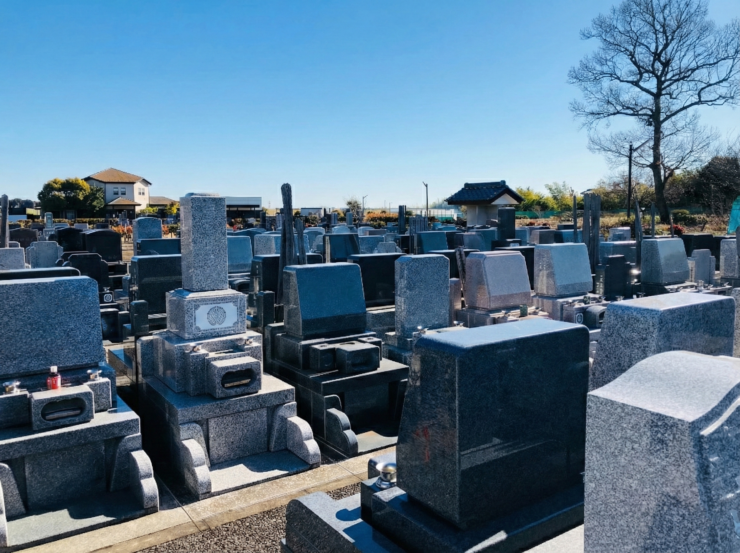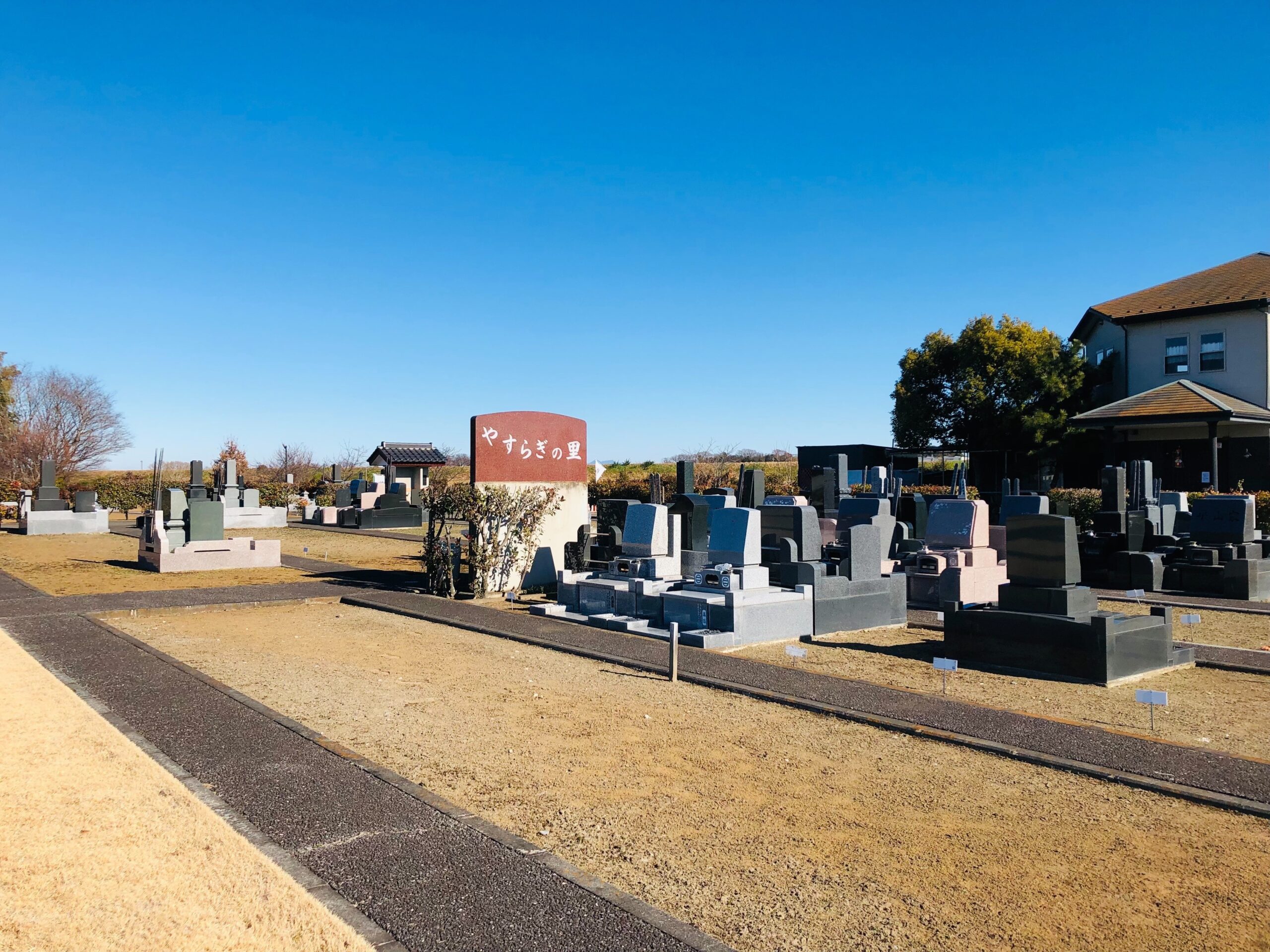 松伏町の穏やかな住宅・田園エリアに位置し、静かな環境で落ち着いてお参りできる雰囲気です。高い建物が少なく、空が広く感じられる開放感が魅力とされています。植栽や舗装通路を整備し、バリアフリーにも配慮したすっきりとした景観が特徴です。